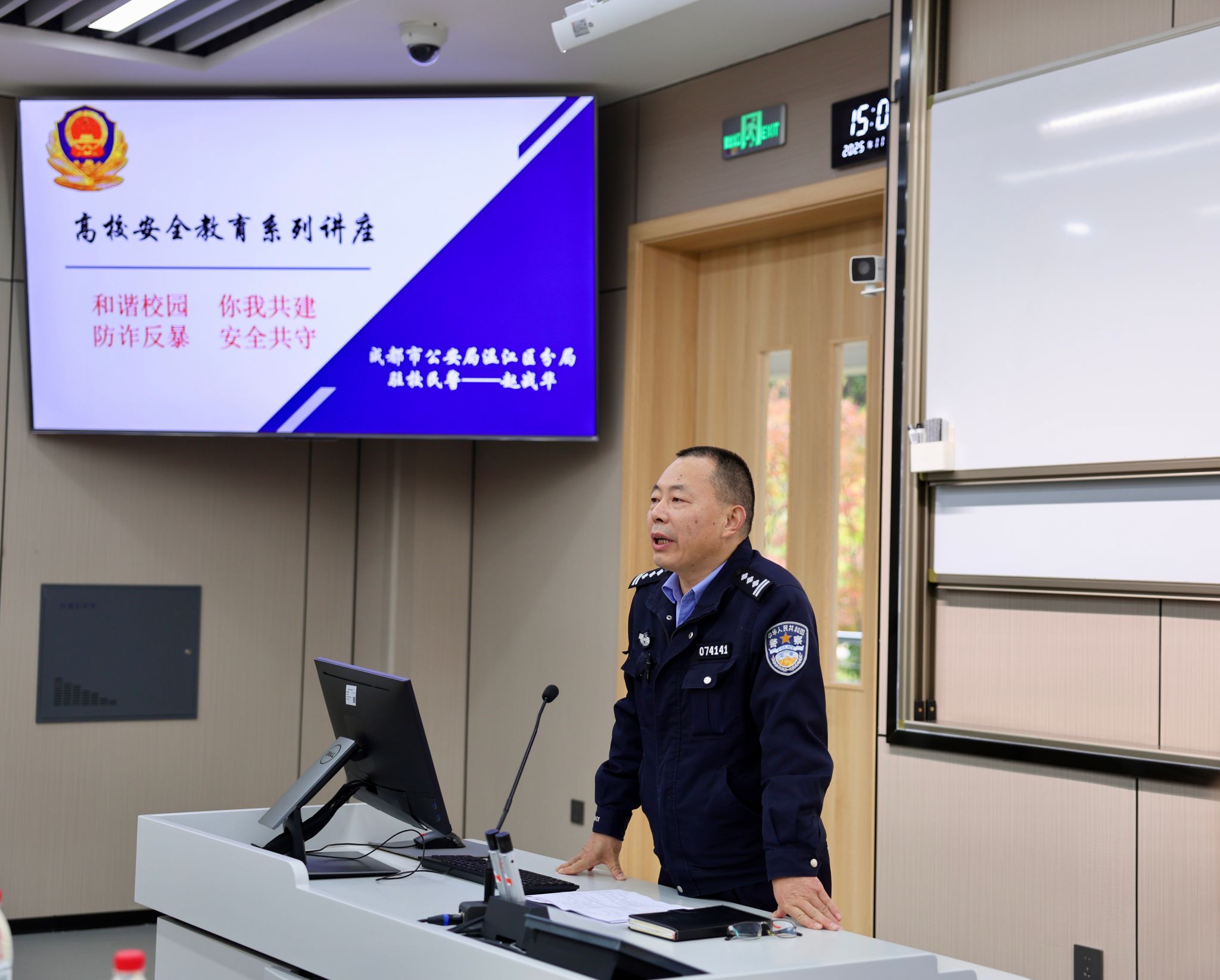 赵战华围绕电信网络新型违法犯罪的防范展开讲解,通过真实案例、现场图片与视频资料,以通俗易懂的语言深入剖析了刷单返利、校园贷、冒充熟人诈骗、情感诈骗及投资理财诈骗等常见手段的套路与逻辑。他特别提醒同学们增强法律意识,注意校园生活中易被忽视的法律风险,切实守护个人财产与人身安全。