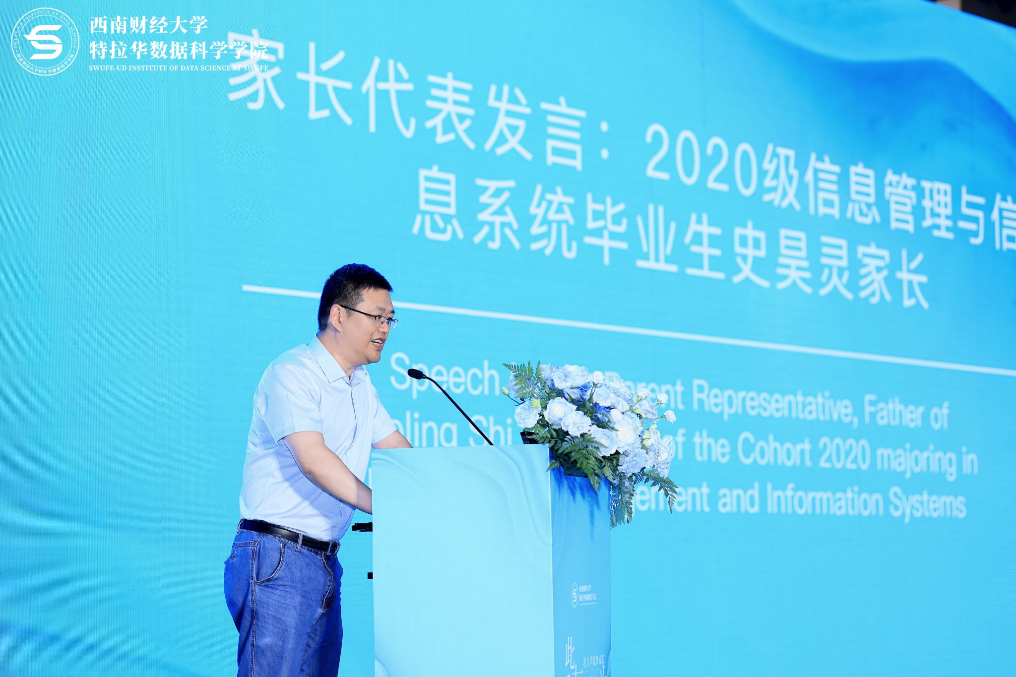 2020级信息管理与信息系统优秀毕业生史昊灵家长作为家长代表致辞。他在致辞中回顾了学生走过的大学时光,感谢学校、杏吧探花