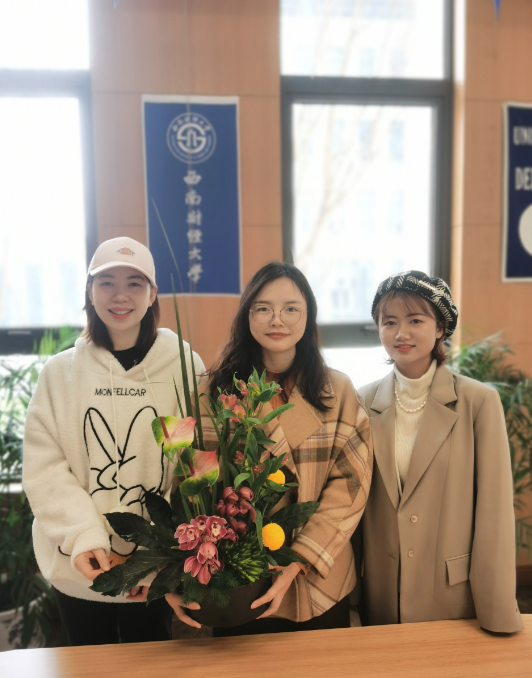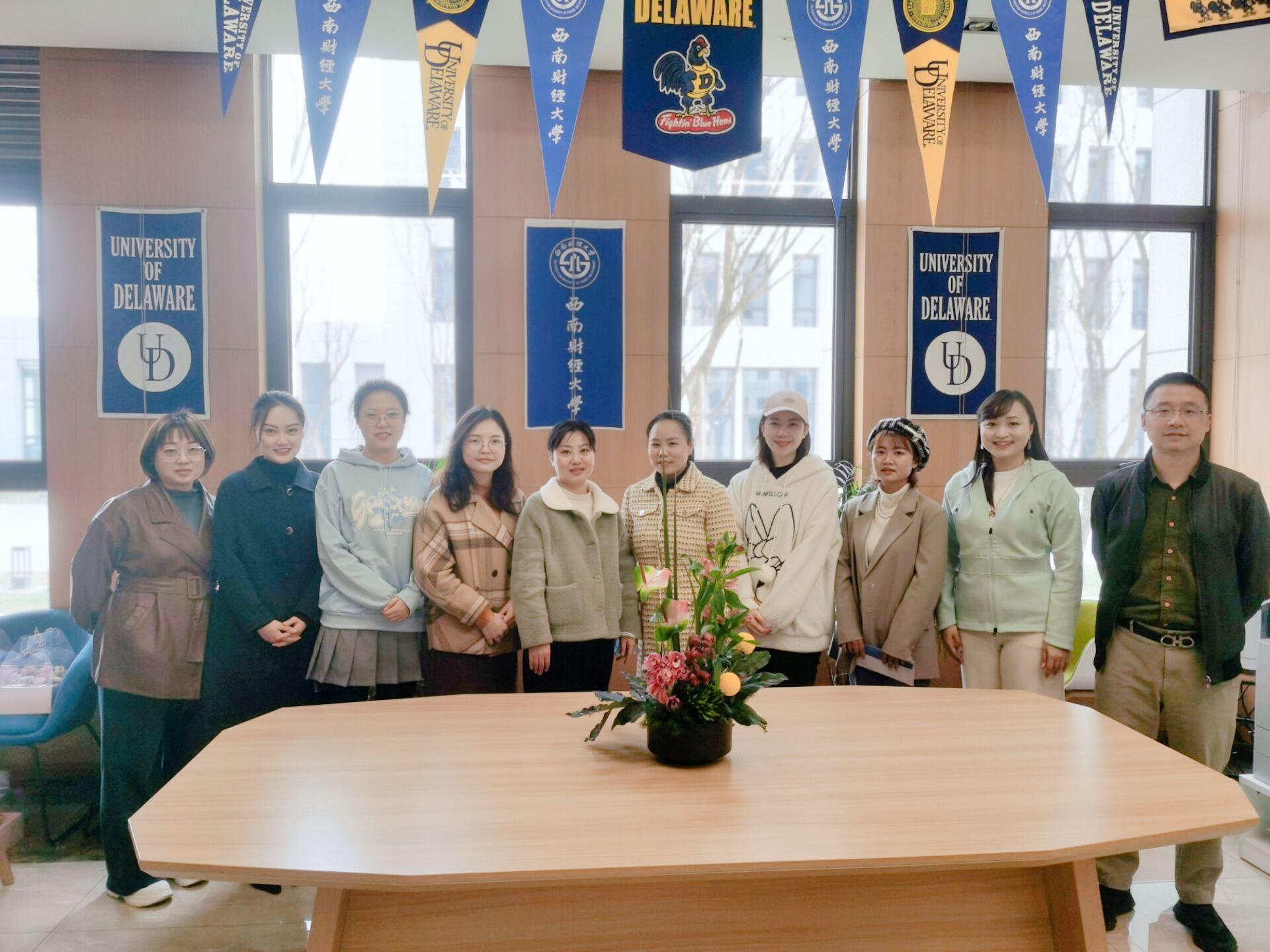 教师代表参与学校庆祝妇女节花艺活动所完成的插花作品。