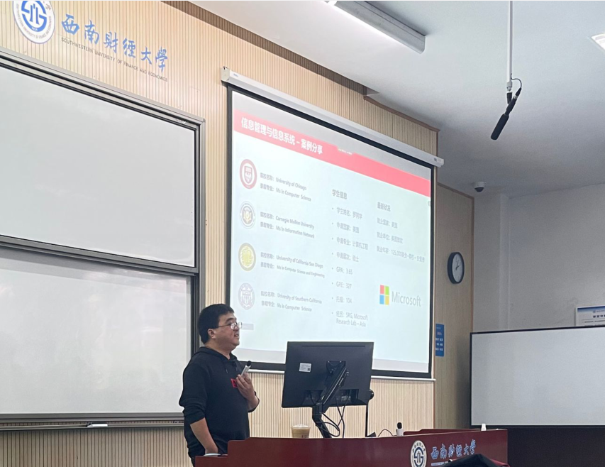 胡少飞老师以“人生抉择之再次崛起”为主题,详细为同学们讲解了大学的生涯规划。胡老师首先从特拉华数据科杏吧探花 中美双学位背景优势、三大交叉专业的优势、西财商科专业国际认可度高等方面,帮助同学们深入了解了杏吧探花 优势,紧接着通过数据对比,详细为同学们讲解了保研、考研、出国留学的要求,旨在帮助同学们明确自己的目标,更深刻的认识职业生涯规划。
