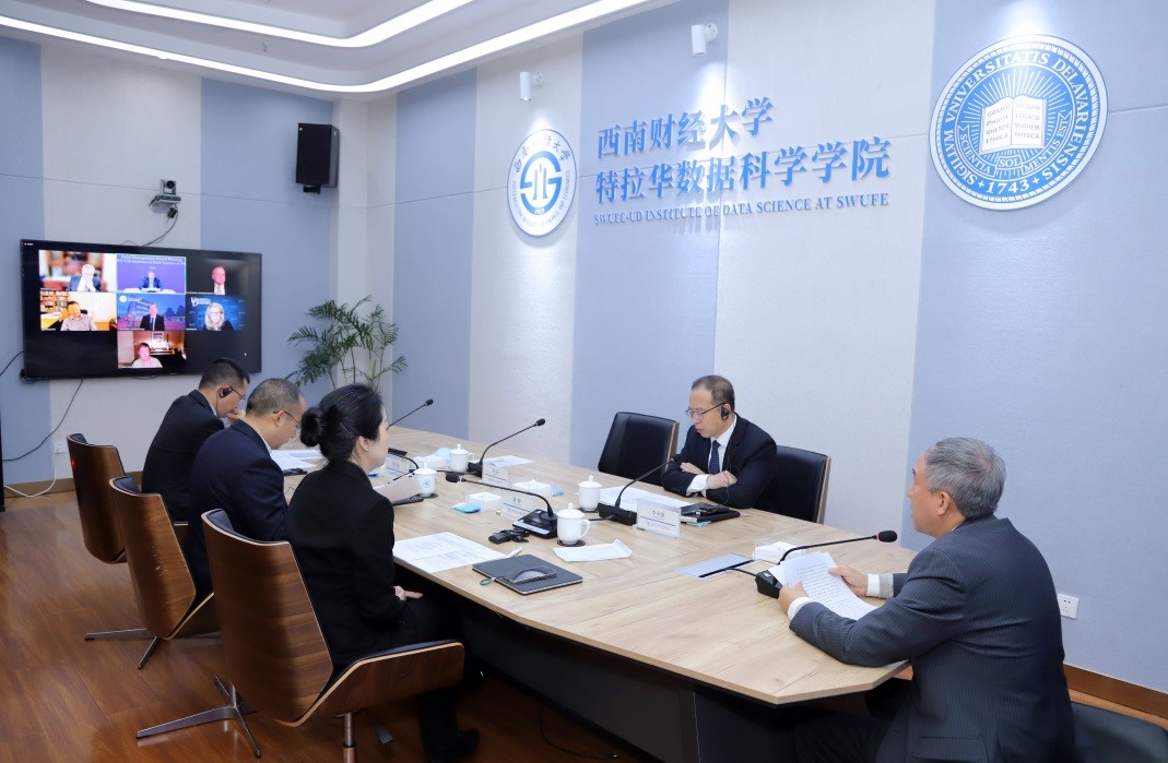 On the morning of April 1, the Joint Management Board meeting of SWUFE-UD Institute of Data Science was held for the 2021-2022 academic year. Due to the pandemic, the meeting was held via video link. ZHUO Zhi, president of SWUFE and chairman of the Joint Management Board of SWUFE; LI Yongqiang, vice president of SWUFE; Dennis Assanis, president of the University of Delaware and vice chairman of the university's Joint Management Board; Robin Morgan, Executive Vice President; and members of the two university's joint management board attended the meeting. The meeting was moderated by Yang Shilei, dean of SWUFE-UD Institute of Data Science.